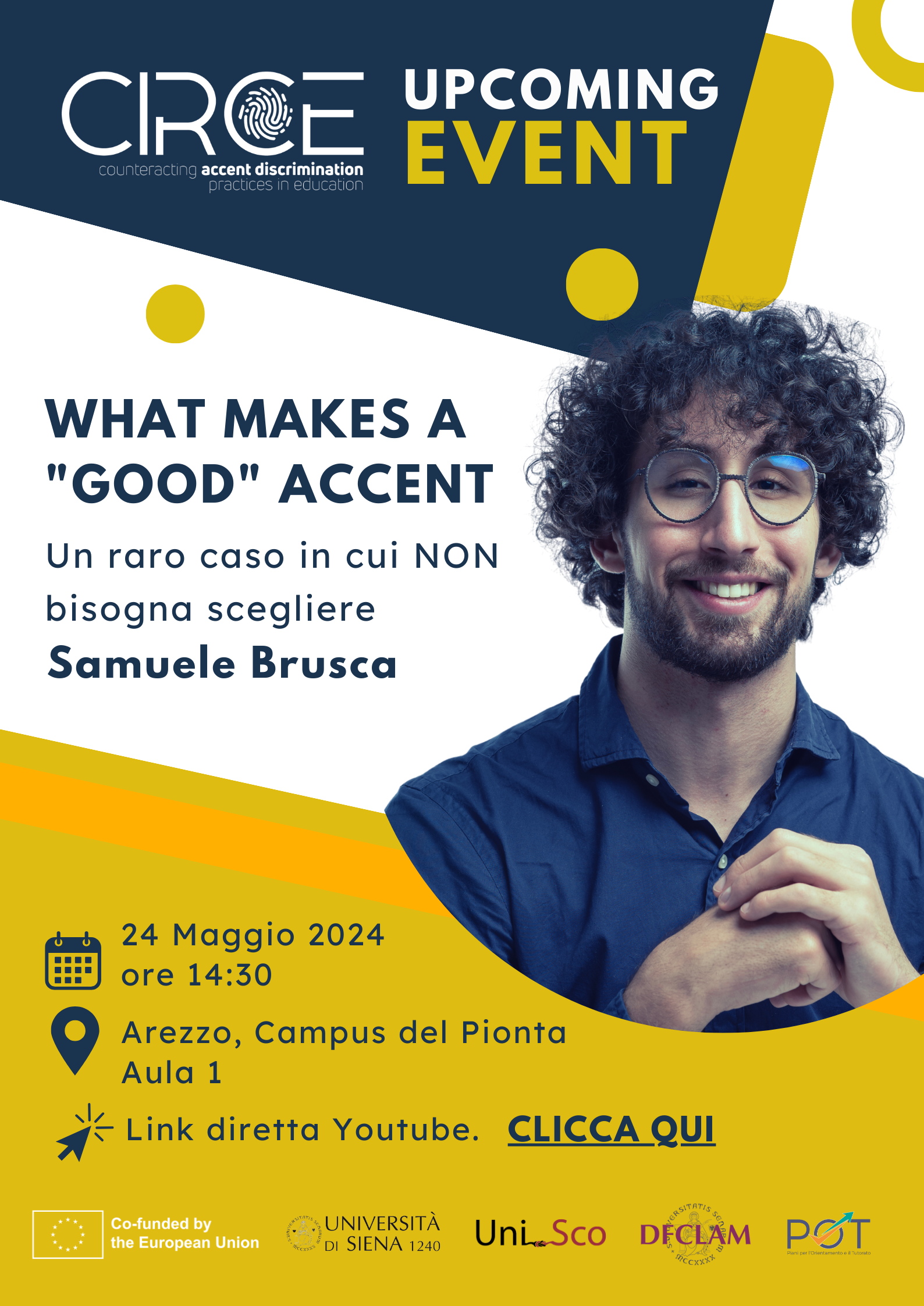 On Friday 24 May 2024 at 14.30 CEST, influencer Samuele Brusca gave an invited talk “What makes a “good” accent. Un raro caso in cui non bisogna scegliere”. The event took place in Arezzo. The recording of the event is available at this link.